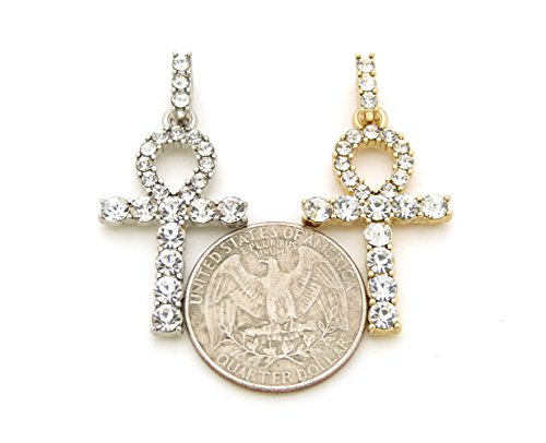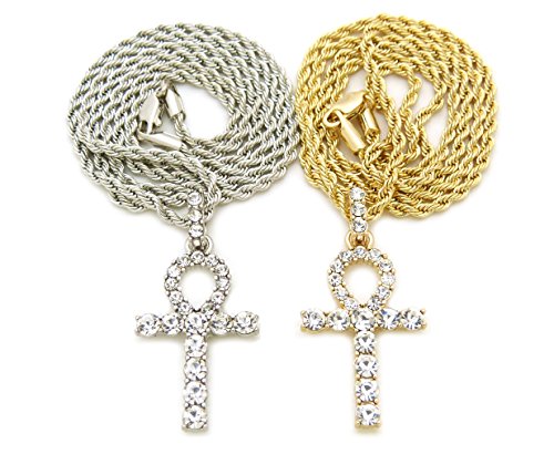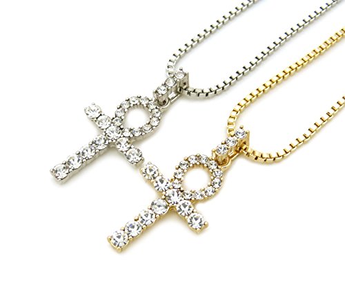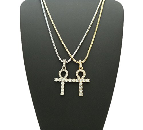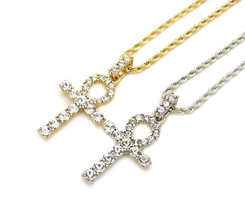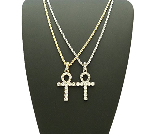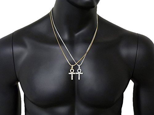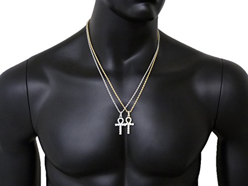 -. Feature : Egyptian Pave Double Ankh Pendant 24" Various Chain 2 Necklace Set in Gold, Silver Tone / Size of Pendant: 0.75" X 1.6" / Chain: 2mm 24" Box Chain Set, 2mm 24" Rope Chain Set / Imitation Gold Color Plated, / Fashion Costume Jewelry