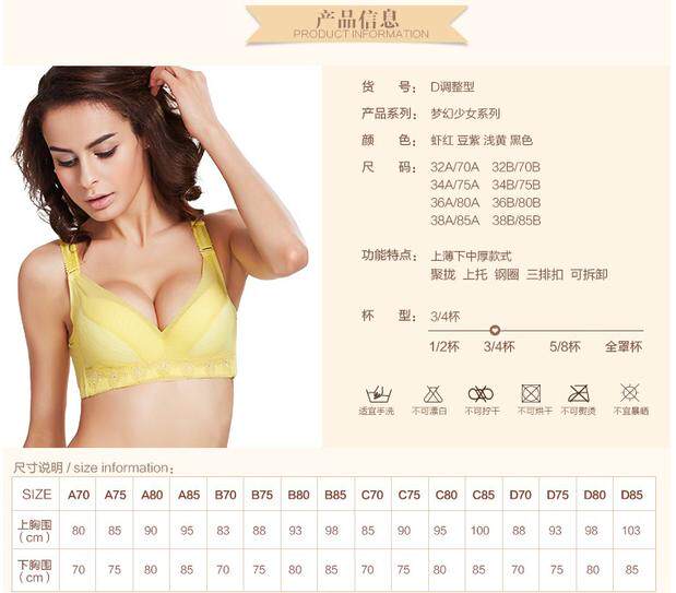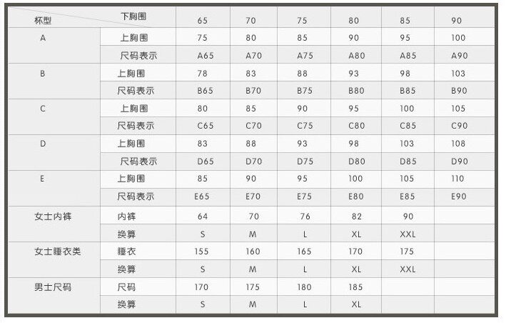 尺码: 80B=36B ,80C=36小C, 85B=38B ,85C=38小C, 90C=40小C, 95C=42小C, 75B=34B, 75C=34C ,90B=40B ,95B