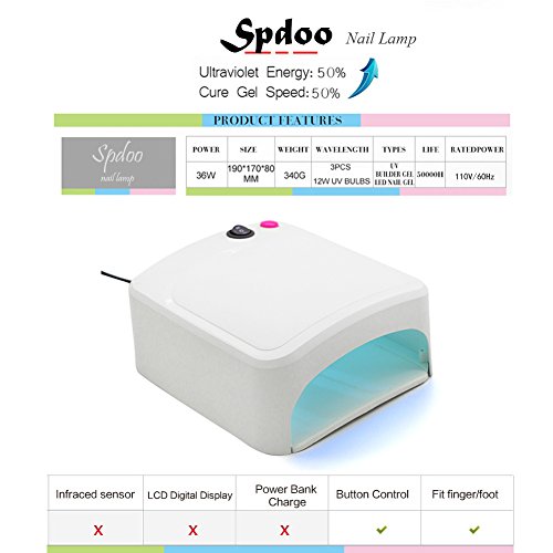 Studio : Spdoo Publisher : Spdoo Binding : Misc. Product Description Direction of Use 1. Apply your gel polish according to its usage instructions. 2. Press the ON/OFF button until lamp turns on. Use the appropriate auto-timed setting (per your gel polish's requirements). The lamp will automatically shut off after the listed time. 3. For best results, avoid moving your hand too much until curing is complete. 4. Please note that curing requirements vary based on gel polish brand. This lamp is for UV gel polishes only. Ensure that your polish is compatible before purchase. 0