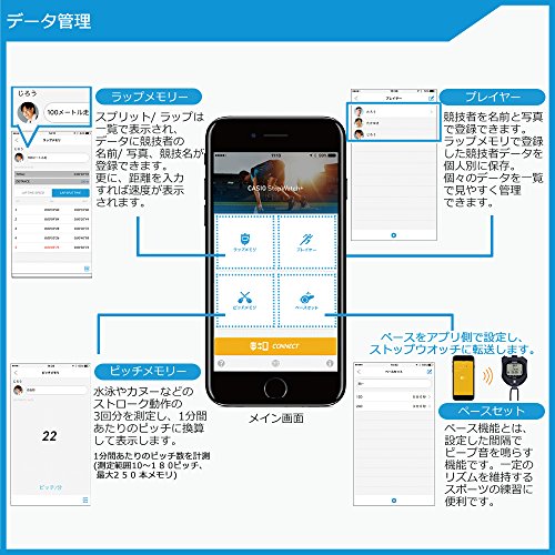 모바일 링크 기능 : 스톱워치 계측 데이터 송신 기능(랩 split의 일람표시)/ 피치 계측 데이터 송신 기능 / 페이스 설정 기능 / 화상 부착 플레이어 설정,플레이어별 계측 데이터 관리 / CSV 형식에 의한 데이터 전송 / 자동 시각 합해 기능
