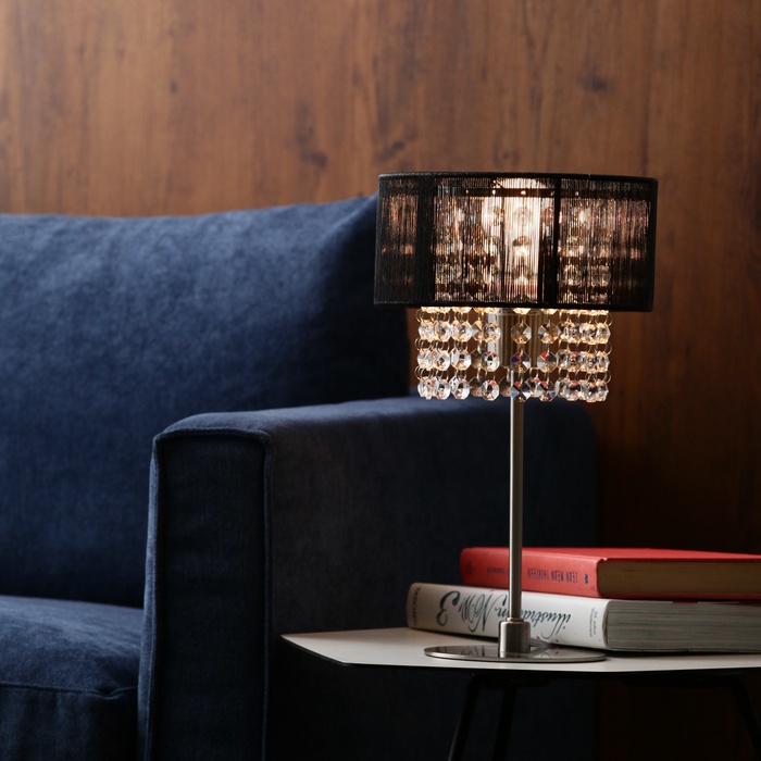 라메감이 있는 스트링 소재의 쉐이드를 사용한 테이블 램프입니다.아크릴은 아니고 수정 유리를 매닮이다 듯한 모양이고 있으므로 빛의 반사가 아름답고,밤은 방을 한층 더 고저스(gorgeous)에 연출해 줍니다.소파나 베드의 싸이드,보드 위에 좌우 대칭으로 두어 주면 보다 분위기가 나옵니다.