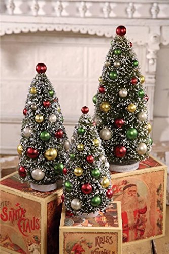 Heirloom quality! This beautiful, bottle brush tree set is perfect for your Christmas decor. It's festive style is the best for showing off your Christmas villages (not included). This set includes (3) trees that are 9.75", 11", and 13" in height. The trees are green with snow flocking and feature shiny, multi-color balls. Each tree has a base that stabilizes the tree and allows you to position them in any arrangement you desire. Makes a great gift!! Add to your collection today!!