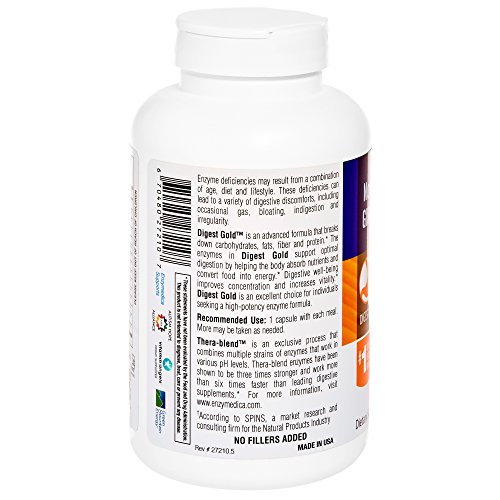 EXCLUSIVE THERA-BLEND PROCESS: Digest Gold contains lipase, amylase, cellulase and protease Thera-blend enzymes for breaking down carbohydrates, fats, fiber and protein, respectively. Multiple strains of enzymes are combined to ensure that enzymes are activated at multiple pH levels. Thera-blend enzymes have been shown to be three times stronger and work more than six times faster than leading digestive supplements.