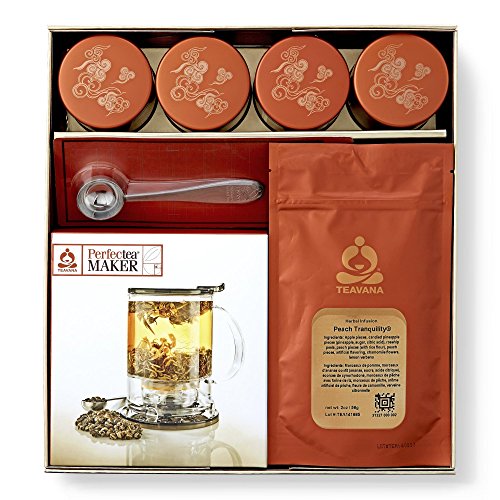 Feature : One of our most popular gift items that includes everything needed to create a perfect cup of tea! / Four of our most popular teas: Youthberry/Wild Orange, Maharaja Chai / Samurai Chai, Peach Tranquility, and Jade Citrus Mint / This special gift set makes over 60 cups of tea and is dressed to impress in a copper gift box adorned with our logo / Excellent for the tea lover in your life, whether they are a beginner or connoisseur / Set includes our 16oz Perfectea Maker, 16 oz of Perfectea Rock Sugar, a Perfectea spoon, 4 exclusive airtight reusable tea tins, and 4 of our most popular teas (2 oz each)