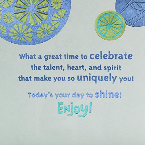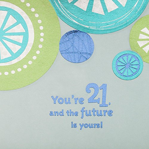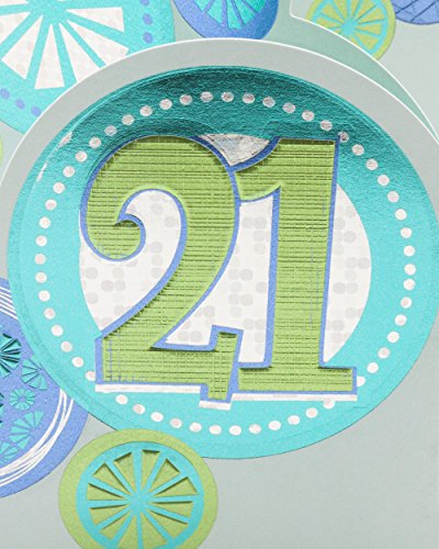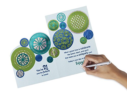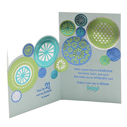 Studio : Hallmark Marketing Company, LLC (Office) Publisher : Hallmark Marketing Company, LLC (Office) Binding : Office Product Product Description Offer birthday wishes for friends, family, and others on their 21st with this card designed with stamped overlapping circles with various designs in shades of green and blue, with a large, offset"21" in bright green. The message on the front of the card reads, "21." Open the card to reveal the inside message, "You're 21, and the future is yours! What a great time to celebrate the talent, heart, and spirit that make you so uniquely you! Today's your day to shine! Enjoy!" The card measures 7.2 inches long by 5 inches wide made with high quality cardstock paper; an envelope is included. All Hallmark cards are made with paper from well-managed forests. Hallmark was founded in 1910 when 18-year-old J.C. Hall arrived in Kansas City, Missouri, with a couple of shoeboxes of postcards under his arm and the American dream in his heart. Today, more than a century later, Hallmark greeting cards are sold online and in nearly 40,000 retail stores across the globe and people continue to recognize the iconic Hallmark brand as "the very best." 0