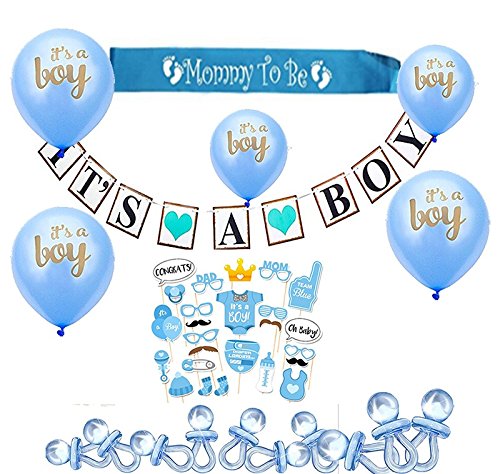 - SET INCLUDES: One piece blue "mummy to be" sash, 20 pcs large acrylic pacifiers, 3 meters long "It's a boy" banner that's easy to hang, 10 pcs 10 inches "It's a boy" balloons, and 25 pcs of baby photo booth props for all your selfie needs.