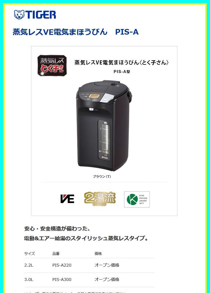 ●タイガー PIS-A300T 蒸気レスVE電気まほうびん 「とく子さん」 2.91L ブラウン