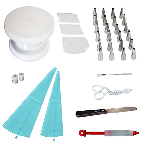 Studio : Norman Industries Publisher : Norman Industries Product Description Norman Industries - Cake Decorating Kit Includes the following; 1 x Cake Turntable 1 x Spatula 3 x Icing Smoothers/Scrapers 1 x Icing Pen 24 x Icing Nozzles 2 x Silicone Icing/Pastry Bags 2 x Pastry Bag Couplers 1 x Flower Scissors 1 x Cleaning Brush Product Details This kit is designed to include everything that is required to create cake decorations like a pro. The Cake Turntable runs on internal ball bearings giving it a smooth gliding motion. The kit comes with 2 washable Silicone Pastry Bags so you can use 2 icing colors at the same time. The Silicone Pastry Bags have their own Quick Release Couplers so it is a very simple process to change Piping Nozzles on the fly. The 24 Piping Nozzles can create a mutitude of intricate and fancy designs with different sized outputs for small and large designs of the same type. This bakeware supplies set for beginner or pro is a must have rotating sculpting utensil. A gadget that can be used for everything from cupcake frosting to fondant modelling to using the buttercream star or leave dispenser tip to create amazing results. This set will provide you with hours of enjoyment and will enable you to create masterpieces for your loved ones. You will be the wonder of all social gatherings to come. We hope you enjoy your new Cake Decorating Kit and are getting excited about your first creation right now. 0