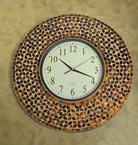 This decorative handmade rich beautiful Amber flower mosaic wall clock in arabic dial has protected glass cover and has silent non-ticking high quality quartz battery operated movement. Requires one AA battery (not included), elegant and well made, will match most wall decor and furniture. It is perfect for Housewarming gift, holiday gift etc.Feature