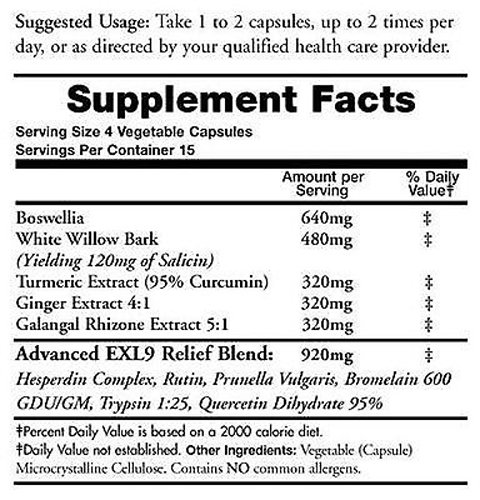 -. Feature : Our Anti-Inflammatory Advanced EXL9 is the natural alternative to over-the-counter or prescription anti-inflammatories, all of which have can have negative side-effects. / Utilizing the highest quality all natural ingredients, Anti-Inflammatory Advanced contains herbs, enzymes and botanicals that are designed to work together to help you find relief from inflammation-induced pain. / With Boswelia, White Willow Bark, Curcumin, Ginger root and A. Galanga / Our proP.R.Ietary Advanced EXL9 Relief Blend with enzymes, botanicals and flavonoids boosts the overall effectiveness of all the ingredients to make Anti-Inflammatory Advanced EXL9 the natural alternative for your health needs. / Anti-Inflammatory Advanced contains herbs, enzymes and botanicals