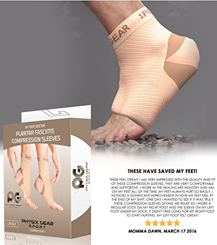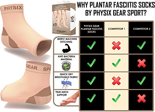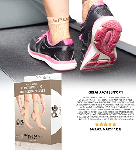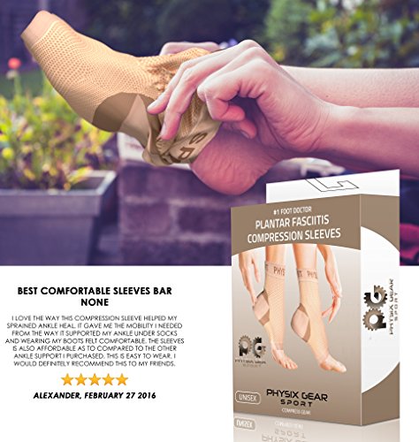 #1 RECOMMENDED DESIGN from top selling Physix Gear Sport brand, preferred by trainers everywhere for anyone suffering from troubling Plantar Fasciitis, Ankle, Spurs Pain. The ankle brace sock support features compression on the bottom of the sleeve - helping relive plantar fasciitis pain by compressing the plantar fascia ligament. Its thin design allows to be worn all day or night to help relieve fasciitis feet pain. Edema Treatment or Heel Spurs creating speedy recovery & Blood circulation