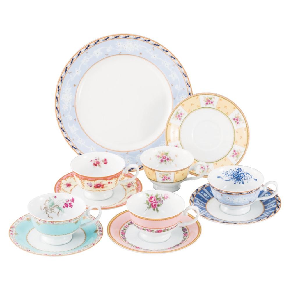 | 絵柄の違う5種類のカップ&ソーサーと大きめのプレートがセットになった華やかなティーセットです。 |