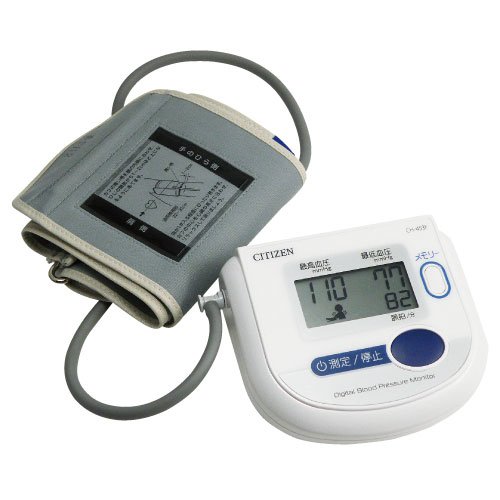 「シチズン電子血圧計(上腕式)CH453F」は、大きく見やすい大画面でワンボタン測定のかんたん上腕式血圧計です。血圧と脈拍の2段同時表示。90回分のメモリーに加えて最新測定値の3回分の平均を表示する親切機能。腕にやさしいソフトカフです。測定中に手や手首などが動き、大きな圧力変化を検出した場合、測定終了後に「体動マーク」でお知らせします。また測定中の脈の間隔が不規則な場合、測定終了後に「脈間隔変動マーク」でお知らせします。
