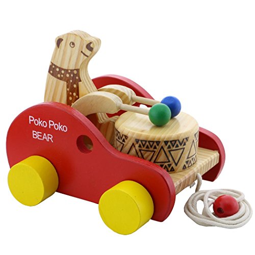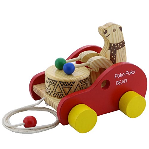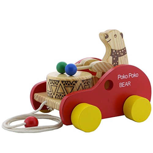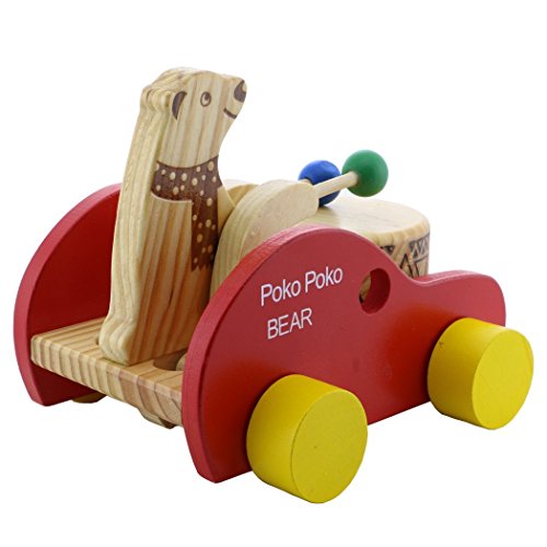 Product Size:16×15×14cm,By pulling the string of the toy car,wooden bear will move its arms