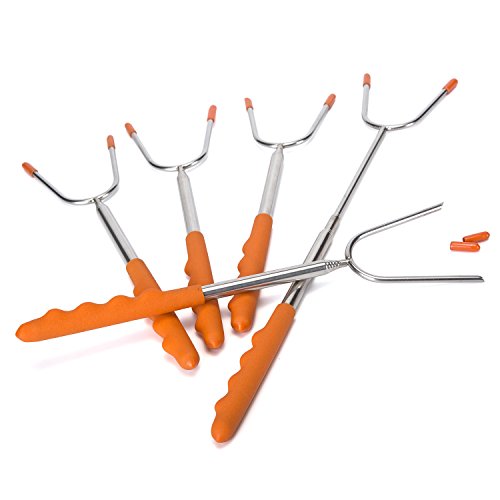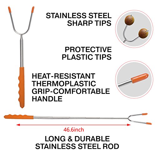 - 45inch extra-long extendable telescoping forks and it can adjust the length according to your need and keep you and your kids at a safe distance from the fire pit. Rubber handles feel comfortable with finger indents giving you a firm and steady grip