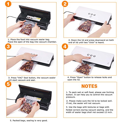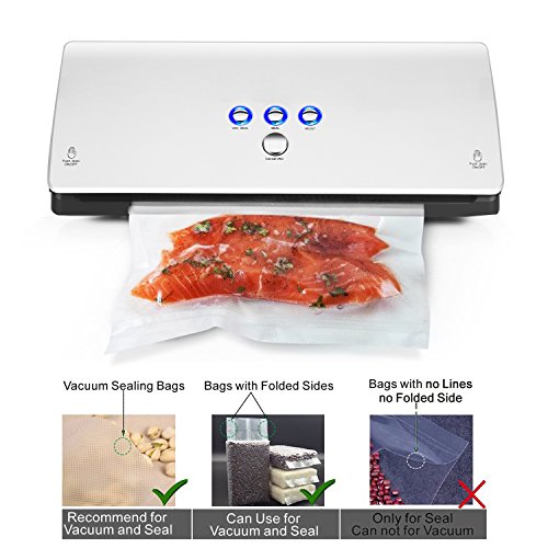 [Easy Operation Vacuum Packing Machine Supplies Convenience]: Once you press the VAC button, it will start the automatic system which is the most convenient way to seal the food. When in Seal system, you can seal with non-vacuum to keep soft or delicate food from damage. And you can stop sealing whenever you want by pressing [Cancel VAC] button. Even the beginner can use easily because of the minimalist pane and the manual gives step by step instructions with pictures. The buttons are all on top