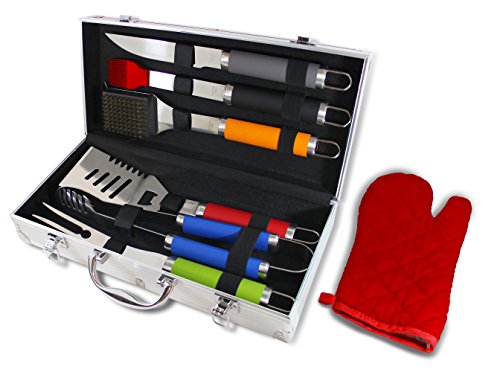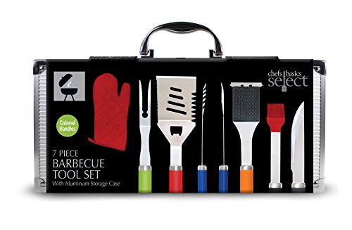 Studio : Kovot Publisher : Kovot Product Description This Chef Basics Colorful 7 Piece BBQ Tool Set And Aluminum Case by KOVOT, is all the equipment you need to grill this season. The set includes heavy duty tongs, bbq fork, slotted turner, all purpose knife, gourmet basting brush, grill cleaning brush, and heat resistant grill mitten. Added bonus aluminum carry case for easy storage and transportation. The utensils are made from professional grade stainless steel construction. They are durable colored handled soft grip tools with hanging loops. Actual Size : Slotted Turner - 14 ½" x 3 ½" BBQ Fork - 14 ½" x 1 ¾" Heavy Duty Tongs - 14 ½" x 2 ¾" All Purpose Knife - 14" x 1 ¾" Gourmet Basting Brush - 14" x 2" Grill Cleaning Brush - 14 ½" x 2 ½" Mitten 10" x 5 ½" Aluminum Storage Case - 7" x 15 ¼" x 3" 0