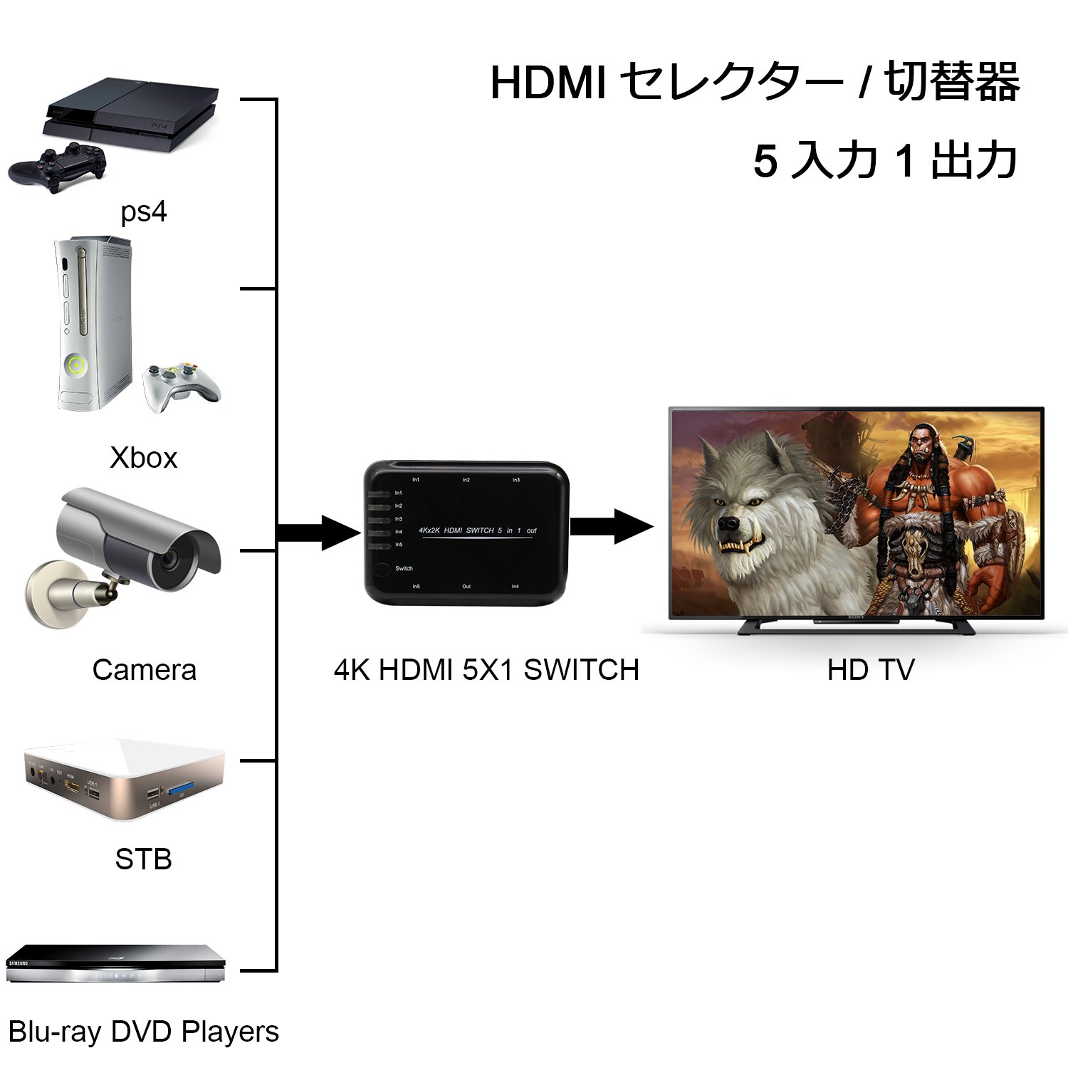 You can easily switch and output 5 video / audio of HDMI equipment to one HD monitor, projector, etc.