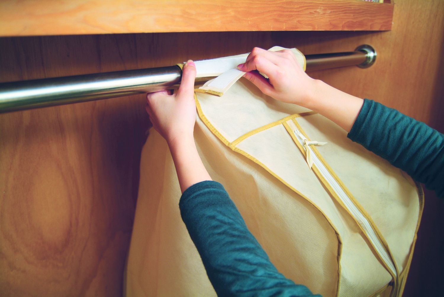 The main body can be attached to the closet or hanger rack etc with the top hook and loop fastener.