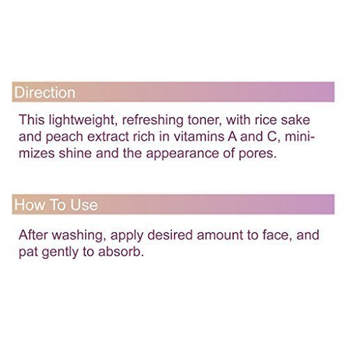 -. Feature : Peach Sake Toner For Pore-Refining / A refreshing toner revitalizes tired and stressed skin with a few swipes / Sake extracts tighten pores and minimize oil production, allowing skin to stay fresh and matte longer