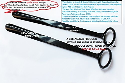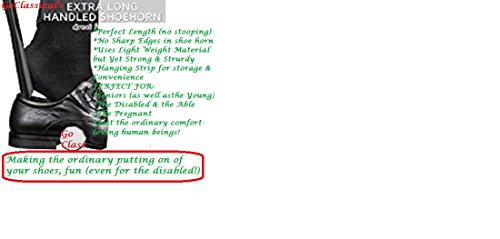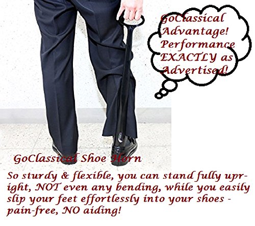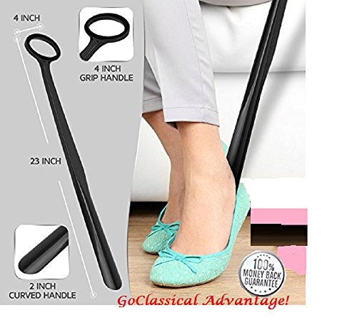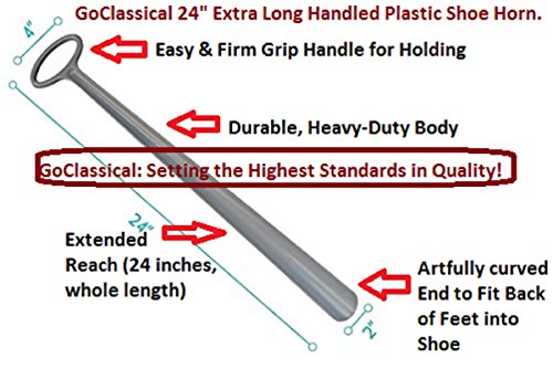 HERE'S THE BOTTOM LINE: There's just one FUNDAMENTAL OVERWHELMING REASON why this GoClassical shoe horn has a stand-out PRODUCT ADVANTAGE PERFORMANCE SUPERIORITY over most other brands. And the reason? Simply, this one possesses the SOLE purpose for which a good shoehorn is had - which is, simply, to make putting on your shoes a breeze without bending, back pains, or aches. That's EXACTLY what the GoClassical extra long shoehorn does! It is 24 inch long made from a sturdy high tech plastic especially most suited for strong long-lasting products, which makes it possible for anyone to put on their shoes without bending or leaning, pain-free. Models' special Super Big Easy Grip Round Handle makes whole palm able to wrap around it to grip and hold, making it ideal for the elderly, people who need some assisted mobility or anyone that wants to avoid hassles putting on their shoes. It comes with a big round handle so that your whole hand can just wrap around it. The grip of the handle is slightly tilted from the rest of the body of the shoehorn making it easy for anyone to grip, hold, and tilt the shoe horn in the ideal angle for putting on your shoes or boots.