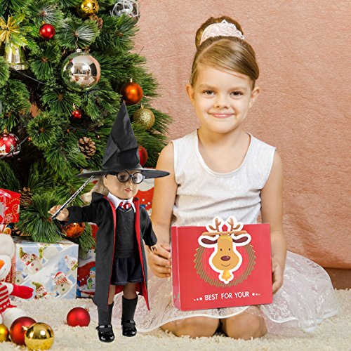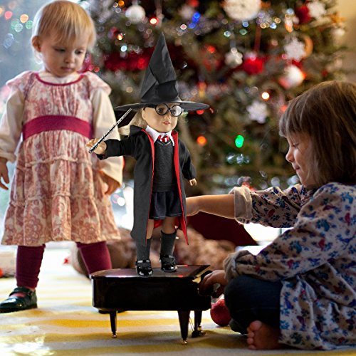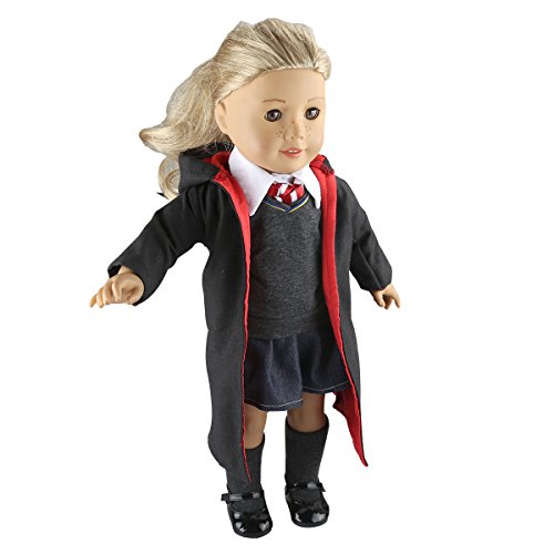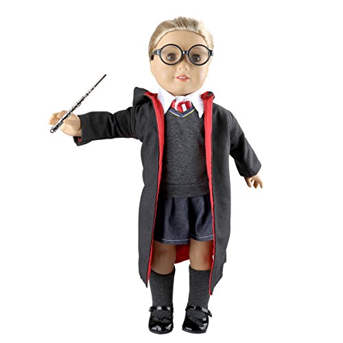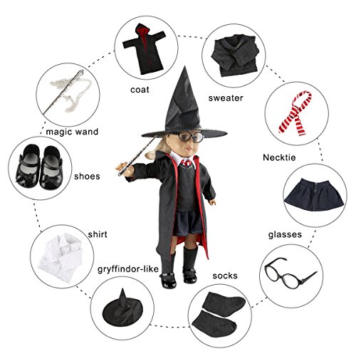 Hermione Inspired Doll Clothes for American Girl Dolls: 10pc Hogwarts Like School Uniform (Hat,Glasses,Shirt, Skirt, Sweater, Tie, Socks, Gryffindor-like cloak,Shoes and Magic wand)
