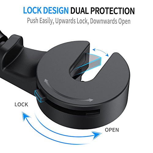 -. Feature : MULTI-FUNCTIONAL:It not only phone holder also a hook,you can put a phone and a bag on it.It can compatible with varieties of smartphones,iPad,tablets,GPS and eReaders and etc. / SOLID AND DURABLE:Stable adsorption,hard to fall off.It has strengthen the magnets,the strong loading capacity can withstand 5Kg weight. / 360°3D ROTATION:Easy installation,put the hook into the headrest lever,lock the latch.Rotate the ball,adjustment any angle arbitrarily you want,all-directional experience. / LOCK DESIGN:Dual protection,push easily,upwards lock,downwards open.Dual hooks for tablet use,liberation your hands and enjoy your time. / ANTI-SCRATCH DESIGN:Anti-scratch silicone,smooth sawtooth cover,protect headrest lever,prevent hooks from having gaps and loosening.Hidden well,almost occupancy a little space.