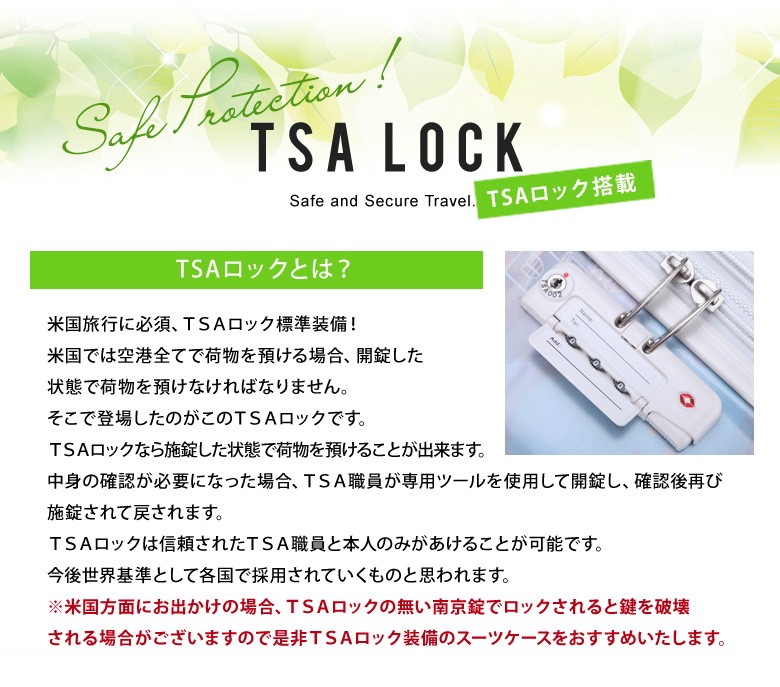 ●世界基準施錠TSAロック搭載!施錠した状態で荷物を預ける事が出来ます。