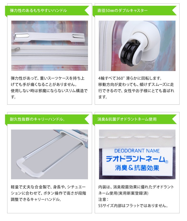 デオドラントネーム(Nippon Dam approved)は、近接空間(ケース内)の不快臭(衣料等、汗などの生活臭)を吸収・中和無臭化し減少させる効果と、銀のプラスイオンがネームに付着した菌の繁殖を抑えニオイ・カビの発生を防ぐ効果がありますので、特に帰国時や使わない時にケースを保管している時でもスーツケース内を清潔な状態に保つことが出来ます。(薬品や科学物質の臭いに対しての効果はありません)
