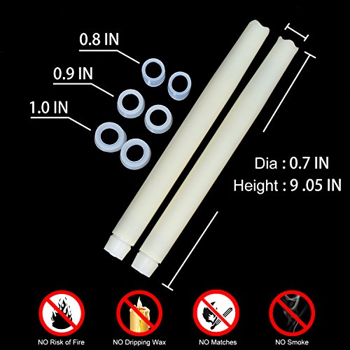 3 different sizes silicone holder adapter including, fiting for most candle holder.Runs on 2x AA batteries (not included). A exellent substitute to traditional taper candle.