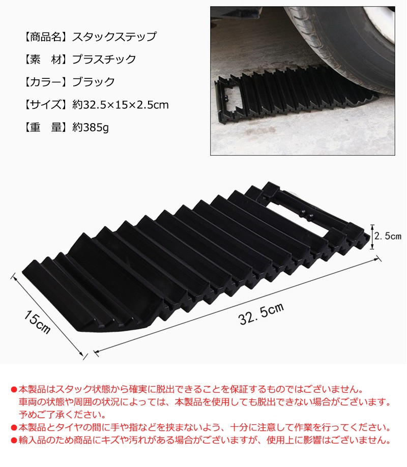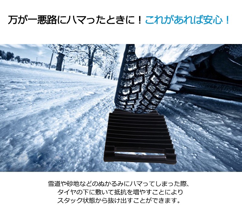 | 商品説明 | 雪路&砂路脱出の強い味方「スタックステップ」です! 雪道や砂地などのぬかるみにハマってしまった際、タイヤの下に敷いて抵抗を増やすことによりスタック状態から抜け出すことができます。 |