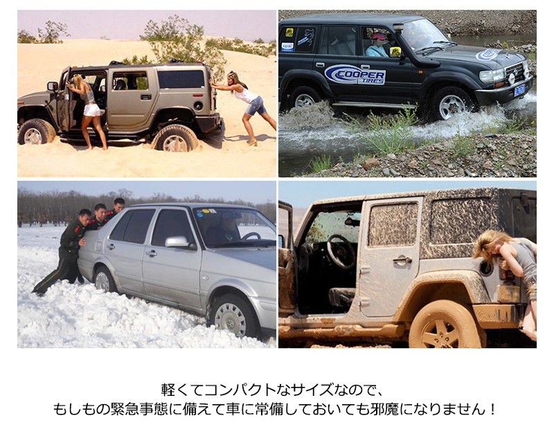 | 注意事項 | ※本製品はスタック状態から確実に脱出できることを保証するものではございません。車両の状態や周囲の状況によっては、本製品を使用しても脱出できない場合がございますので、予めご了承の上お買い求めください。 |