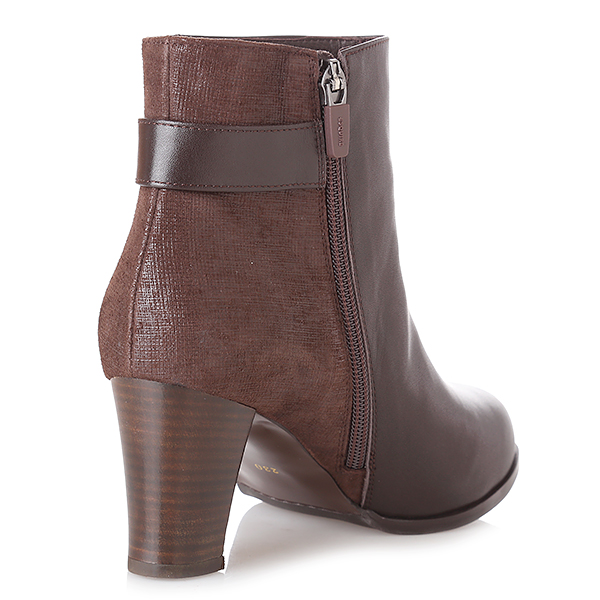 삼각형의 금속장식과 뒤쪽의 텍스쳐가 다른 가죽을 콤비로 디테일을 더한 앵클부츠. 기본형 스타일로 데일리한 아이템으로 활용도가 높음.