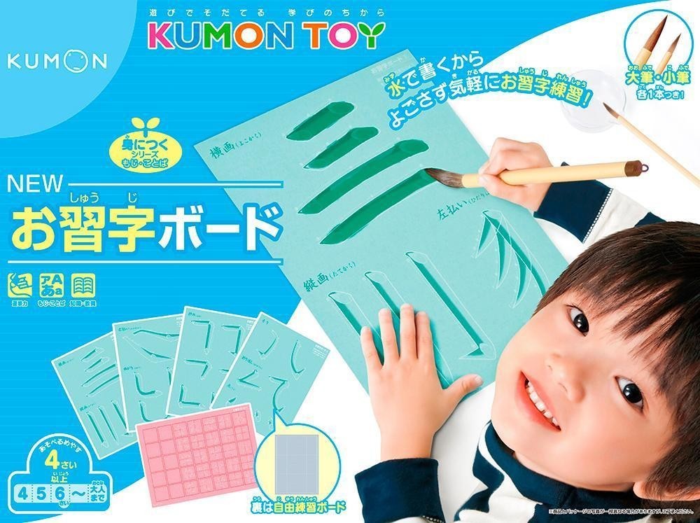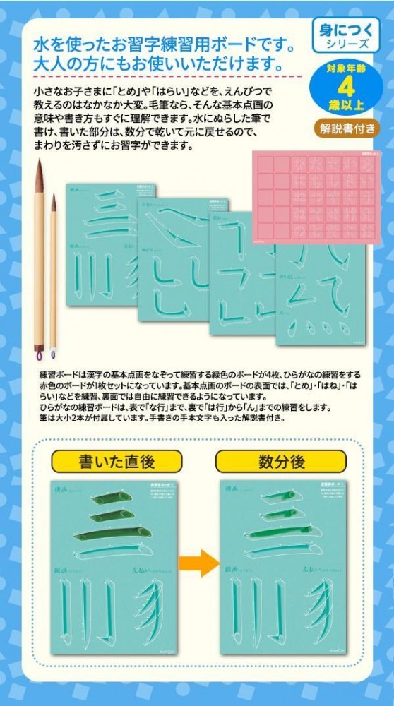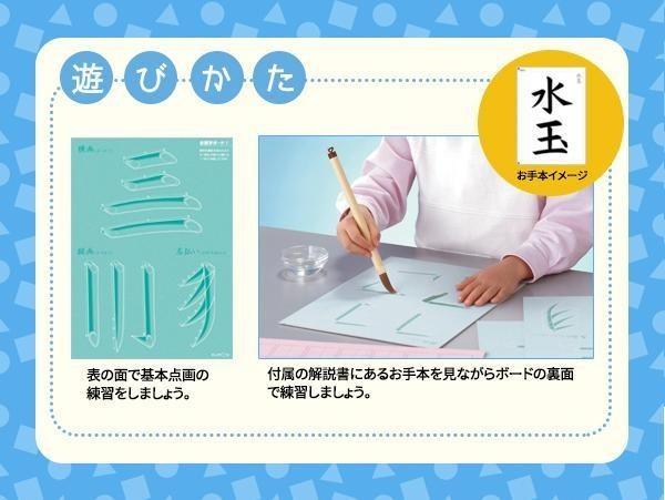 水でぬらした筆でボードの字をなぞると色が変わって、乾くと色が消える不思議なボードで、「とめ」「はね」「はらい」などお習字の練習をします。水で練習するので、手や服が汚れず、何度でも練習できます。 |