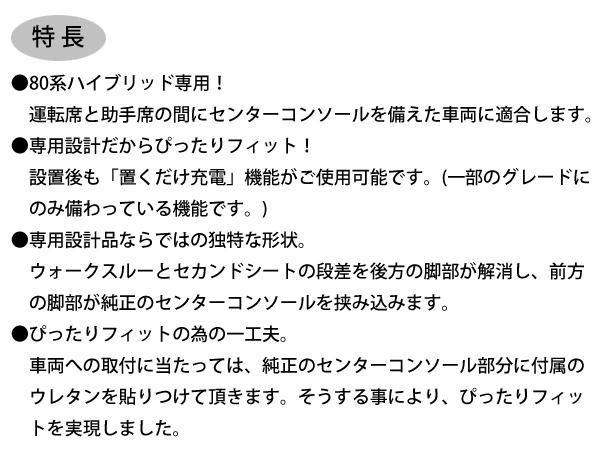 | 仕様 | 80系ハイブリット専用(ドリンクホルダー2個付き) 【適合車種】 ●NOAH(ノア) 年式:H26.1~ 型式:ZRR8♯W・ZRR8♯G・ZWR80G系 グレード:HYBRID G・HYBRID X ●VOXY(ヴォクシー) 年式:H26.1~ 型式:ZRR8♯W・ZRR8♯G・ZWR80G系 グレード:HYBRID V・HYBRID X ●ESQUIRE(エスクァイア) 年式:H26.10~ 型式:ZRR8♯G・ZWR80G系 グレード:HYBRID Gi・HYBRID Xi |