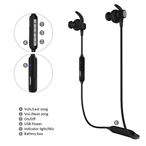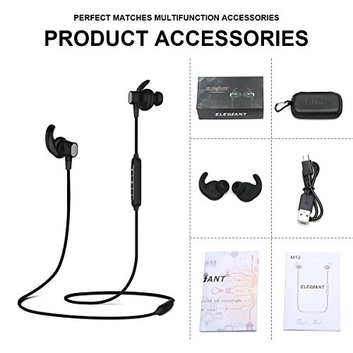 Studio : ELEGIANT Publisher : ELEGIANT Binding : Electronics Product Description Specifications Bluetooth Version: V4.1 Model: M10 Weight: 0.5 ounces Operating Range: up to 10 meters, 33 feet 1 connect to 2 or not: yes Battery: 110mAh rechargeable lithium-ion polymer battery Charging Time: less than 2 hours Playing Time: up to 8 hours Talking Time: up to 8 hours Standby Time: up to 180 hours Features Less buttons. Easy to operate, comfortable and not easy to fall out from your ears. Designed for sports. Designed for sports. You do not need to worry about it being damaged because of your sweat when you are doing sports. IPX4 technology avails you to do any kinds of in-water or on-land exercise. The stylish design with your passion and enthusiasm will make you the spotlight. HIFI stereo sound and clearer voice. The HIFI stereo sound and the built-in mic provide you with full, rich, authentic sound for music and crystal-clear voice for call. Package List 1 x M10 bluetooth headphone 1 x USB charging cable 1 x Additional pair of ear tips 1 x Carry case 1 x User manual 0