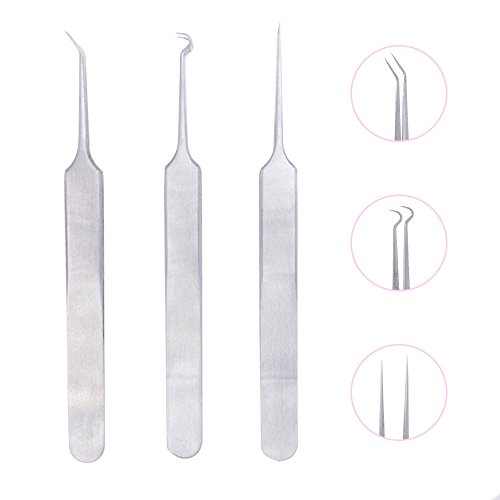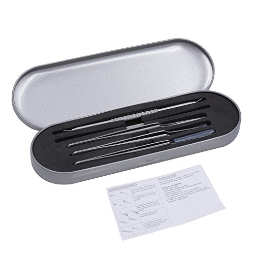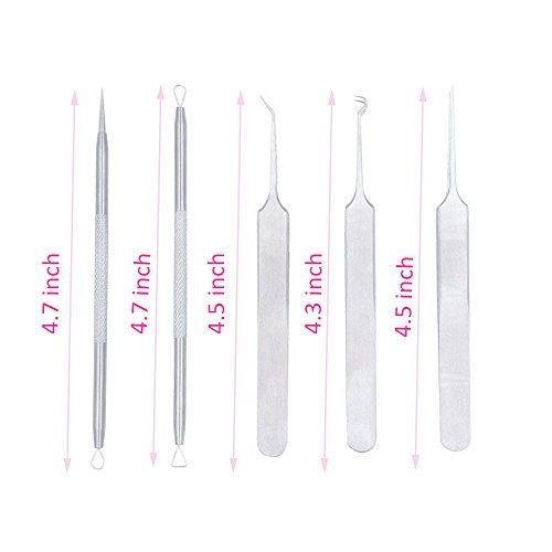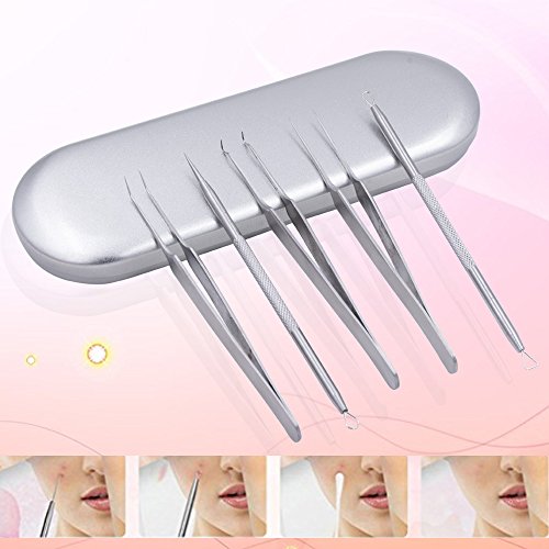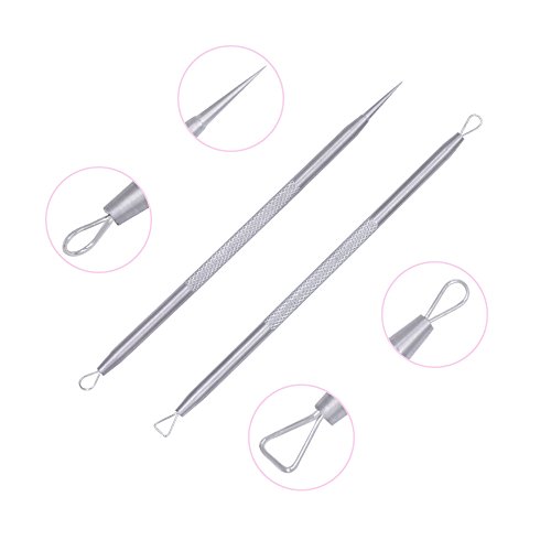 Tools choose: 1.The needle: For puncturing the parts of fibrous tissue under the skin and make the blackheads, acne and pimple turn up. 2.The tweezers: For cleaning the blackhead and whitehead on the two sides of nose, then can clip out the small pimples. 3.Triangular and squeezing loop: Special triangular design removes acne, blackheads and fat granules. Squeezing loop side is better clean up remained blockages after masking. 4.Wide and fine loops: Wide side for squeezing big acne pores without painful and better for face treatment, fine loop is post-care blemishes and cleaning up remaining and better for nose care.