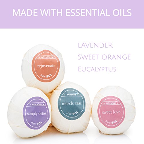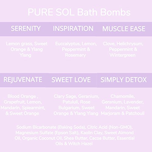 - PAMPER YOURSELF THE NATURAL WAY - pureSOL bath bombs essential oils create 6 different experiences to soothe, heal and rejuvenate your mind and body. Choose from Serenity, Inspiration, Muscle Ease, Rejuvenate, Sweet Love and Simply Detox. Proudly made in the USA and all made with LOVE.