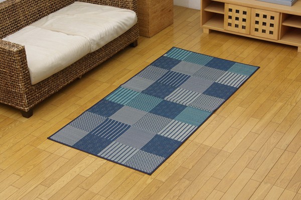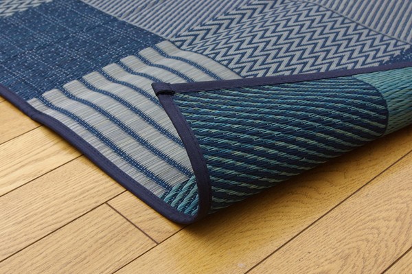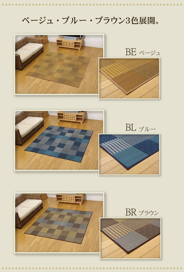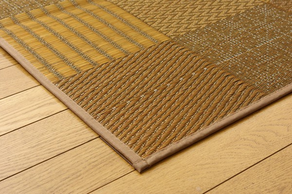 いろいろな織りを組み合わせたパッチワーク風のい草カーペットです。織り方によって違う複数の肌感触をお楽しみ頂けます。落ち着いた色目でモダンな雰囲気に仕上げました。国産(九州産)のい草を使用しています。一本一本が太く、表皮が厚く繊維がキメ細かいので弾力性があり、耐久性に優れています。い草には空気の自然浄化作用、湿度の調節作用などがあります。また汚れにくく、使用するうちに黄金色に変化し味が出ます。い草に青森ヒバ加工を施しています。(抗菌、防臭効果)