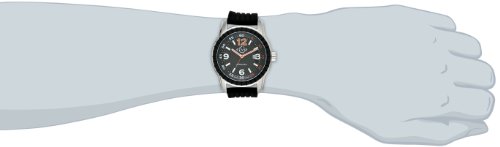 -. Feature : Round watch in stainless steel featuring roulette-inspired spinning case back, textured dial with orange contrasts, and ribbed rubber band / Automatic self-wind Technosablier movement with analog display / Anti-reflective sapphire crystal dial window / Features buckle closure, minute track around dial border, and date window at 3 o'clock / Water-resistant to 50 m (165 ft)