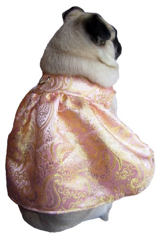 Studio : Sophisticated Pup Publisher : Sophisticated Pup Binding : Misc. Product Description This beautiful party dress will make your sophisticated pup the belle of the ball. It is made of the highest quality satin brocade of a pale pink, peach and gold with an intricate, swirling paisley and floral motif. It is fully-lined in a peach satin. A harness hook is attached to the back so your pup doesn't have to have the discomfort of a harness underneath her clothing. The front closure is a sturdy side-release clasp, the same high quality clasps that are used on our gorgeous dog collars, to withstand any pulling on the outfit. ?This is a luxurious, opulent dress for the most sophisticated of pups.?. 0