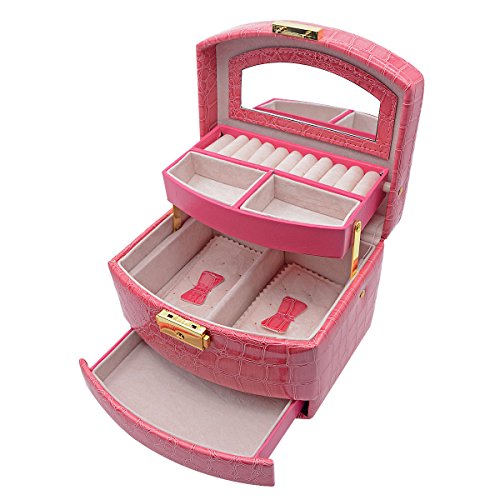 Saim Faux Leather 3-Tier Jewelry Case Slide Open Lockable Jewelry Box, Multi Compartment for Rings, Earings, Necklaces & Bracelets with Interior Mirror
