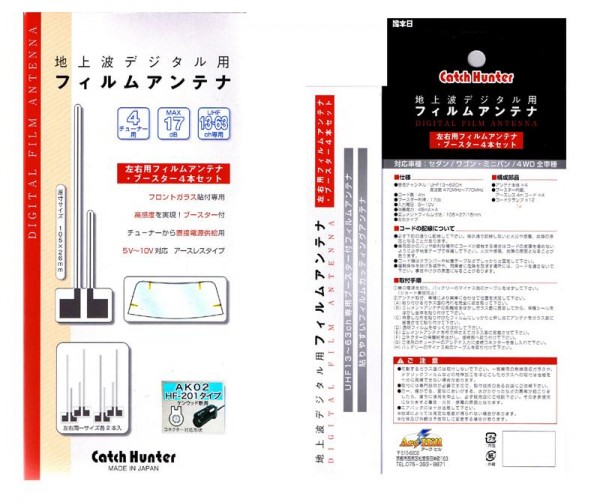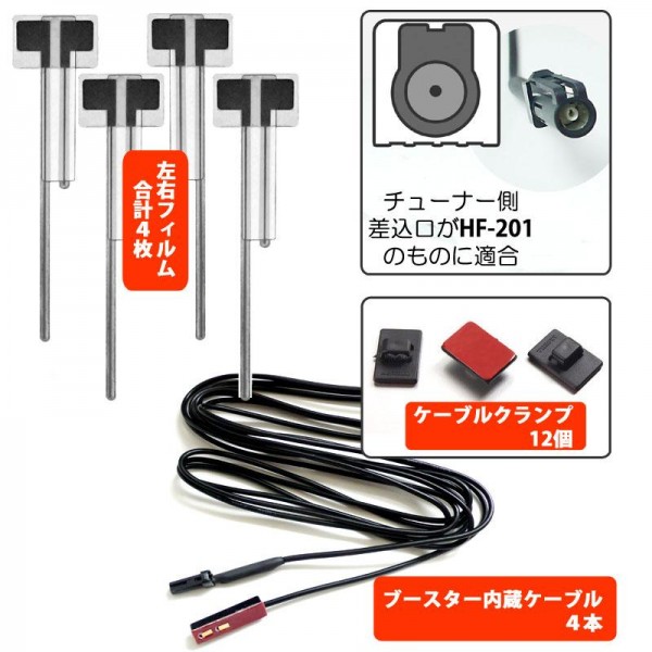 | セット内容 | 左右用フィルムアンテナ×4枚 ブースター内蔵ケーブル(HF-201端子)×4本 ケーブルクランプ×12個 取扱説明書 |