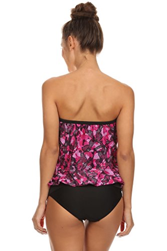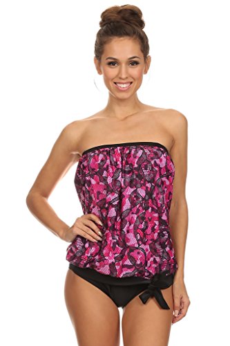 Feature : Bandeau blouson top with Sewn-in bra . Banded hemline with tie for adjustability. Conceals flowing midsection. / Top provides fitted support and includes removable straps for all day wear / Includes high waist lined bottom / 80% nylon, 20% spandex / Made in USA