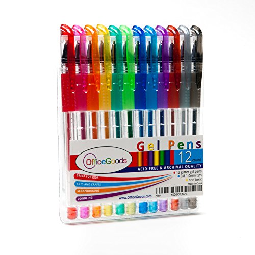 Gel Pen Set by OfficeGoods - 12 Glitter Brightly Colored Pens for Kids and Adults – Fun Premium Arts and Crafts Supplies, Vivid Colors with Fast Drying Ink!