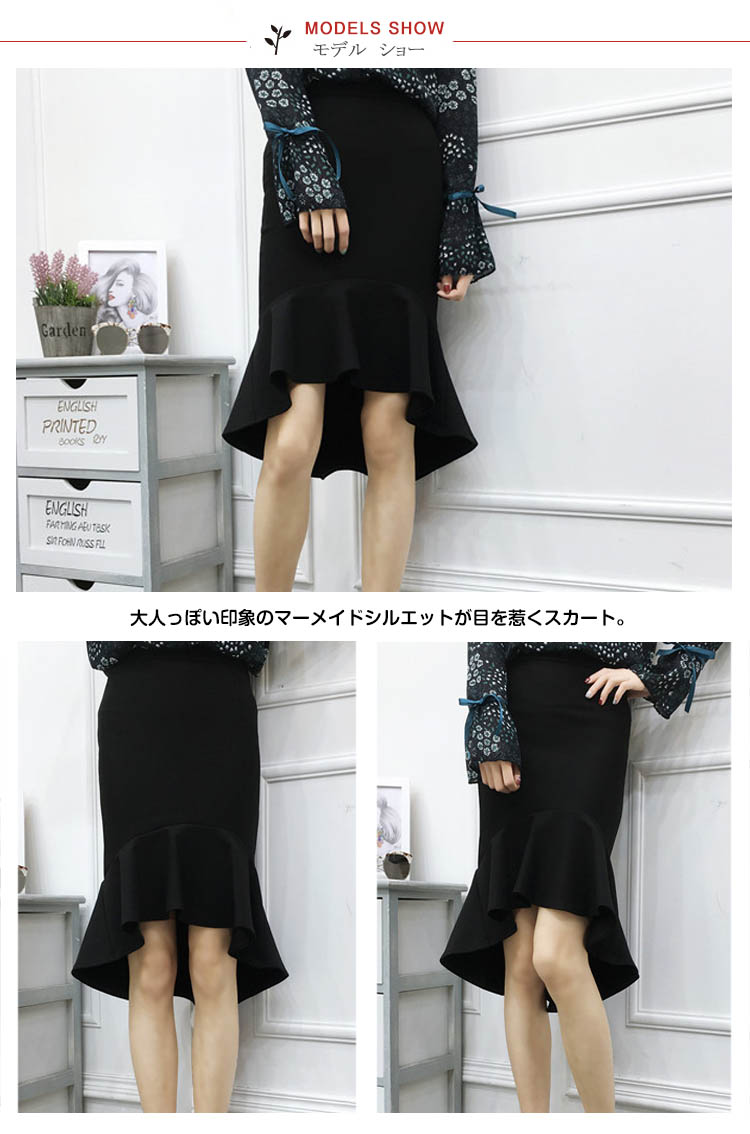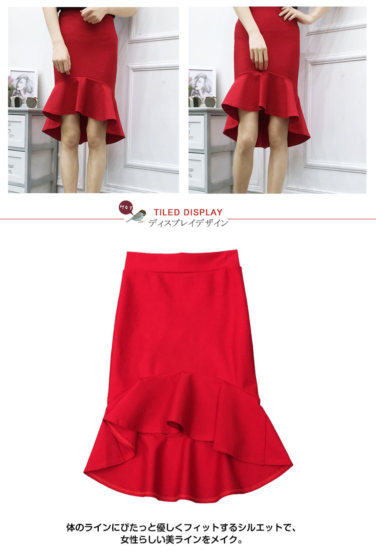 | 大人っぽい印象のマーメイドシルエットが目を惹くスカート。フィット&フレアが美脚効果を高め、ぐっと上品な印象に。程良いハリがある生地感で、綺麗なシルエットをしっかりキープ。体のラインにぴたっと優しくフィットするシルエットで、女性らしい美ラインをメイク。 | |