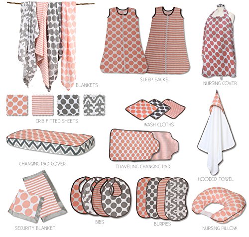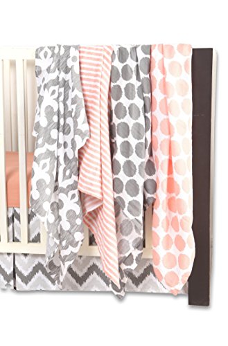 -. Feature : Bacati Ikat Coral/Grey 6 pc Crib Set with 4 Muslin Blankets / Includes solid crib sheet, zigzag grey crib skirt and 4 Muslin Swaddling Blankets / 100% Cotton and Machine Washable and gets softer with every wash / No Gift Wrap