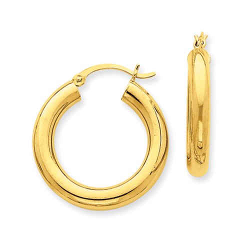 Simple and classic, our polished 14k yellow gold round hoops feature a hinged post and a lightweight, hollow tube design that measures 4mm thick by 25mm (1 inch) in diameter.
