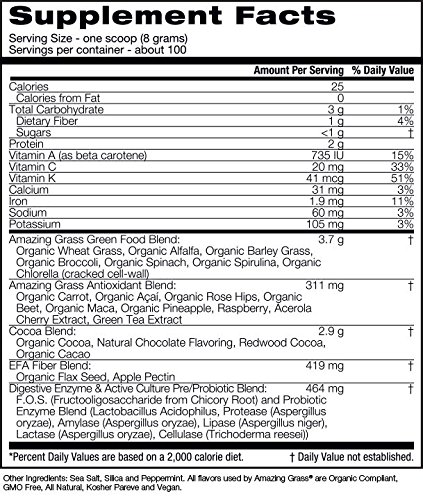 Studio : Amazing Grass Publisher : Amazing Grass Binding : Grocery Product Description This thoughtfully crafted blend combines our alkalizing farm fresh greens and wholesome fruits and veggies with nutrient-rich superfoods plus cacao. With a rich chocolate flavor it's an indulgently delicious way to feel amazing every day. At Amazing Grass our roots run deep...Back to our family farm in Kansas, where for over 3 generations Amazing Grass has organically grown harvested the most nutrient-dense greens on earth. Today, we thoughtfully craft our greens with the highest quality, plant-based ingredients curated from like-minded farmers from around the world. Amazing Grass products are a delicious way to nourish your body with the whole food nutrition it needs to feel amazing every day. 0