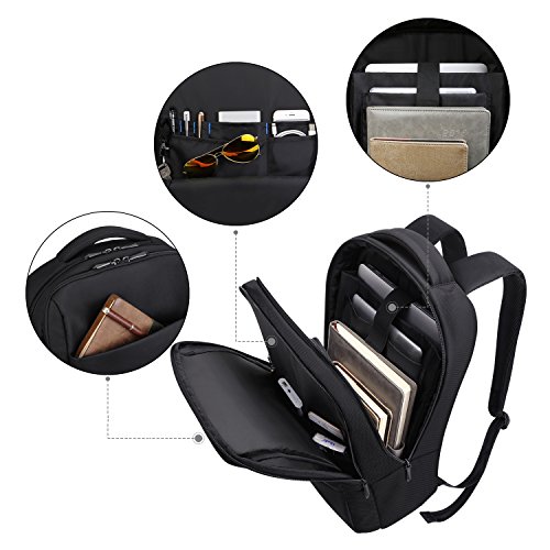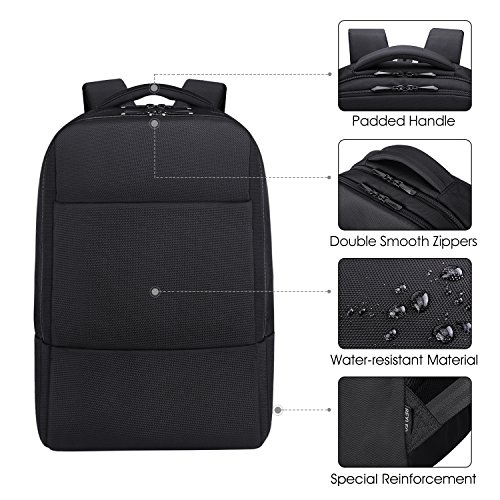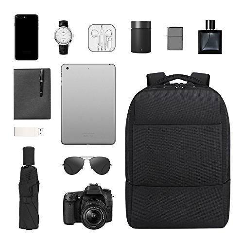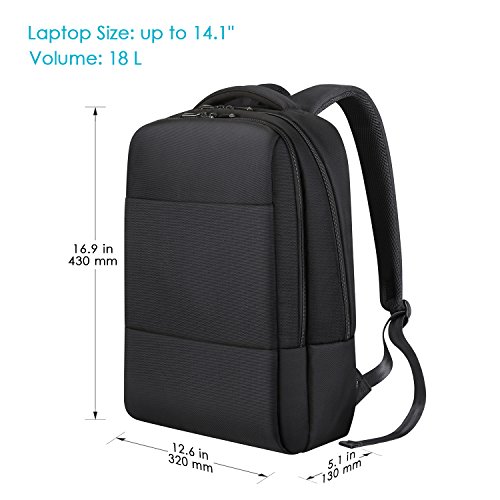 -. Feature : CLASSIC SIMPLE DESIGN - The external of this backpack without any patterns or logo make this backpack simple yet stylish. It could be one laptop backpack for men' or women' work/business trip, also could be a classic casual bag for their daily life. / KEEP YOUR BELONGINGS ORGANIZED BETTER - The main compartment with padded sleeves could keep your laptop (up to 14.1''), iPad and large items organized better. The secondary compartment offers many pockets to your tech accessories and other small items. The front pocket gives you quick access to small items, like phone or wallet. / COMFORTABLE TO CARRY - Made of water-resistant Nylon fabric. The adjustable shoulder straps with air mesh padding and the breathable mesh back for ergonomic support and comfort, which makes your travel feel effortless. Thick cushioned handle allows it easy to hands carry. / MULTIPURPOSE BACKPACK - This size and capacity of this backpack are perfect for your daily use, such as business work, office, school, travel, and shopping. External dimensions: 12.6 x 5.12 x 16.93 inches ( L x W x H). / WATERPROOF, DURABLE, SOLID - The Nylon material has proceeded the waterproof process, making this backpack protect your belongings well in the drizzle days for a short time. But please do not use it in heavy rain. Excellent stitches in the stress point make it solid enough to protect and carry your essentials, even you carrying heavy stuff, such as textbook, laptop.